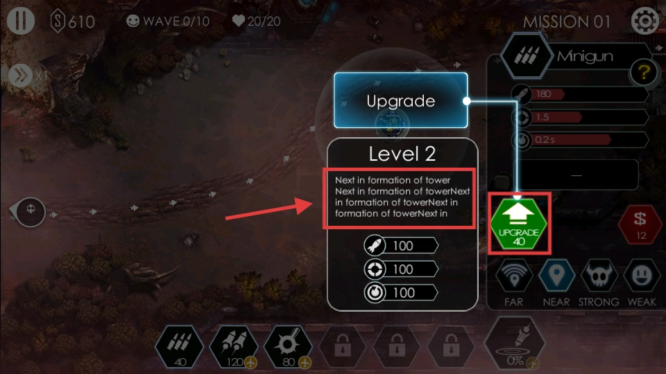 4、点击绿色的【UPGRADE】按钮(会消耗【40】资源),把塔升级到【Level2】,以此提升防御能力。
