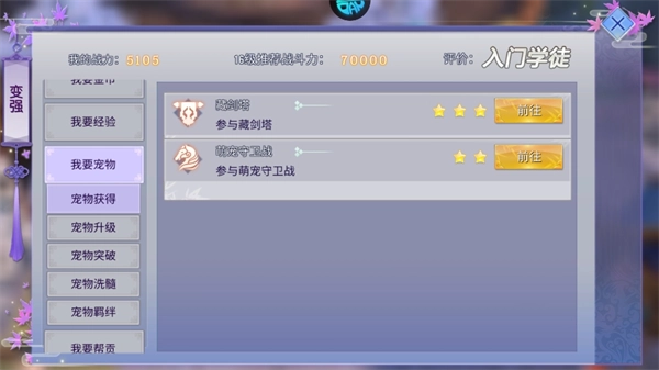 3、宠物可通过宠物、宠物商城、藏剑塔及萌宠守卫等途径获取,获得后能借助升级、突破、洗髓、羁绊等方式提升其战力。