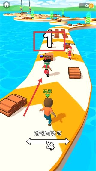 1、跟随【滑动可转弯】提示操控角色,追赶前方排名【1】的对手,同时拾取赛道上的材料箱。