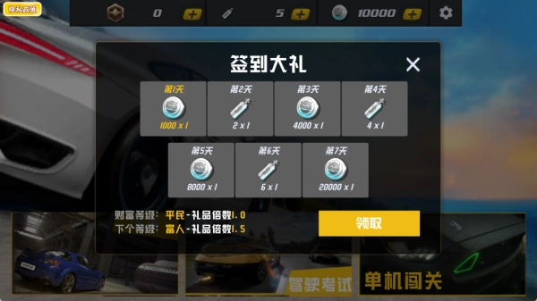 1、每天登录游戏可以完成签到,每次签到都能获得资源奖励,轻松解锁更多的赛车。