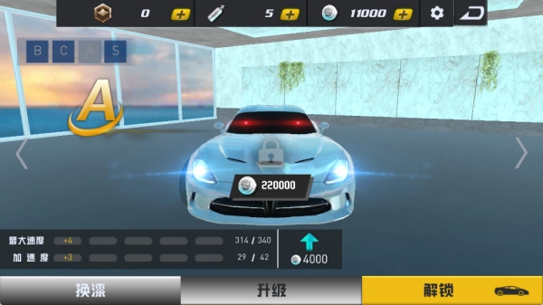 2、车库中有不同级别的赛车可以解锁,还能使用金币来升级赛车,强化赛车的所有性能。