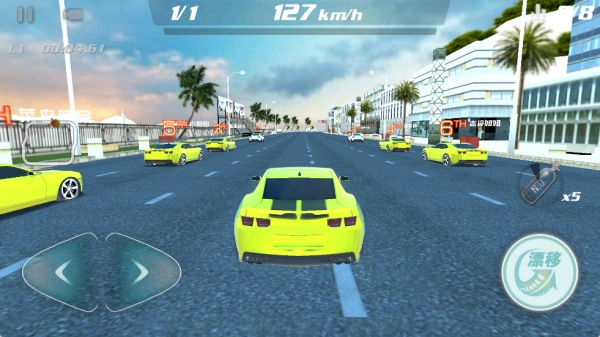 3、比赛中有很多赛车出现,玩家要在各种赛道中飙车,一定要控制好行驶速度。