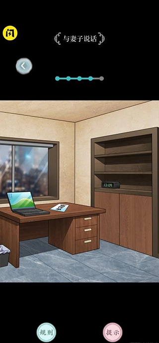 点击垃圾桶,接着打开下方的抽屉,将抽屉里的螺丝刀取出来放到电子表上;之后操作电子表,把时间调整到零点几分的位置,再点击房间的门,妻子就会出现。这时把她头上的发夹移到桌子上,然后点击她手中端着的汤,等灯光闪烁一下后,找到桌子下面的纸条并点击,再点击窗框上方的窗帘,随后点击笔记本,等妻子做出回答,最后点击宣传单,这样就能进入最后一关了。