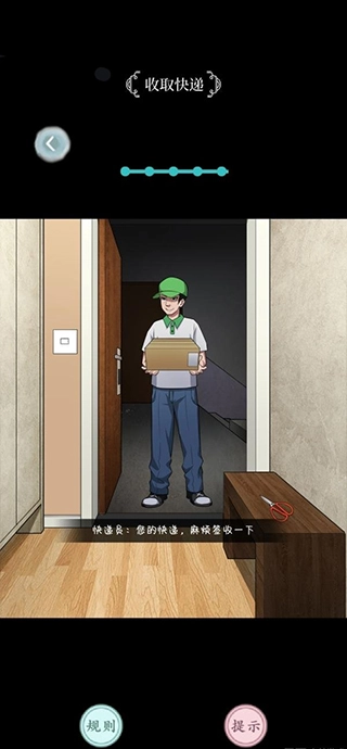 用户需要依次完成几个操作来达成关卡目标:首先触碰那扇门,接着操作左侧的控制装置点亮照明,再将剪切工具移动到包裹物品上,最后查看其中的纸质信息,即可完成当前关卡。