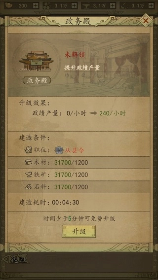 2-2:提升建筑政务殿的等级,该建筑需达到特定等级方可解锁升级权限。