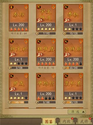 3这里有一批武将,其中稀有度较高的有三十位,他们之中擅长处理内部事务的有六位,其余二十四位则是负责常规作战的类型;另外还有十位稀有度稍低一些的武将。
