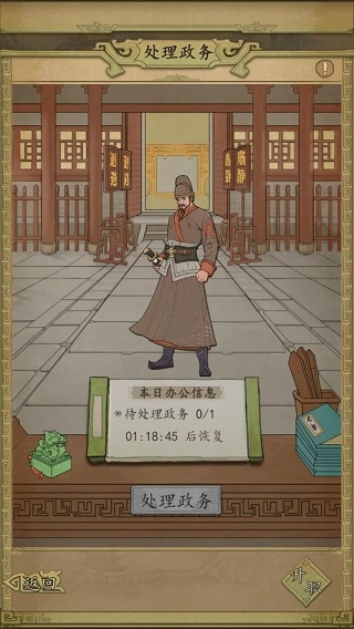 2在城府里处理政务,每2小时可以回复一次政务,最多能累积6次未处理的政务。完成政务后会获得政绩、举荐令和元宝作为奖励,而且你完成政务时的等级越高,得到的政绩就越多!