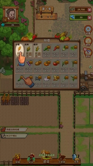 点击建造按钮,在弹出的建造列表里找到并选择耕地。等耕地建造完成后,就可以着手种植农作物了。