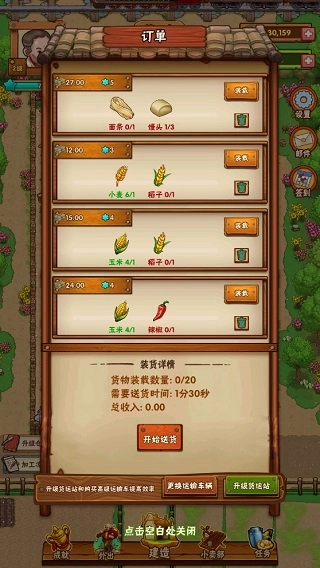 点击门口的订单,里面列出了当前客户的需求,将货车装载完毕之后,便可让外公送货了。