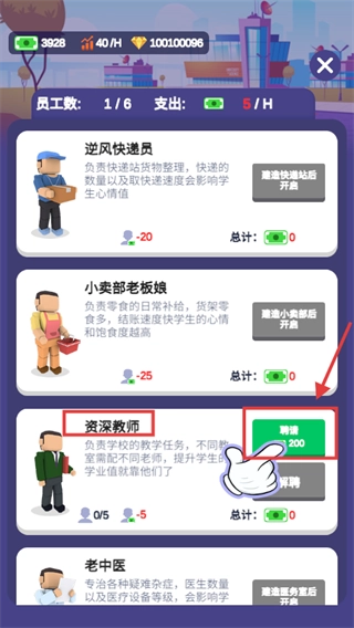 当资金充足时,点击【资深教师】对应的【聘请】按钮,消耗【200】金钱完成聘请操作,以此来提升学生的学业水平。