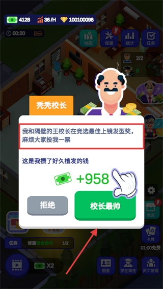 校长发起投票时,点击【校长最帅】选项,可获得【958】金钱奖励,该奖励将用于校园建设。