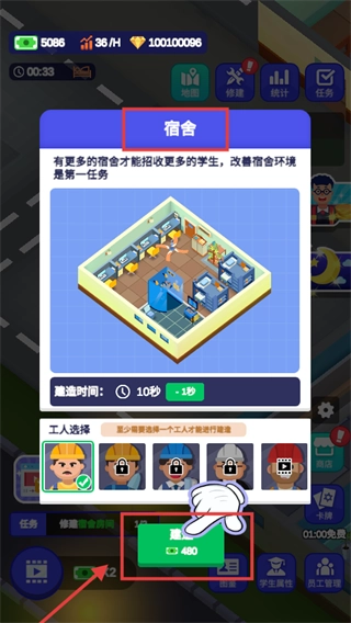 在选择好建造宿舍的工人后,点击【建造】按钮,消耗【480】金钱,等待10秒即可完成建造,之后就能招收更多学生了。