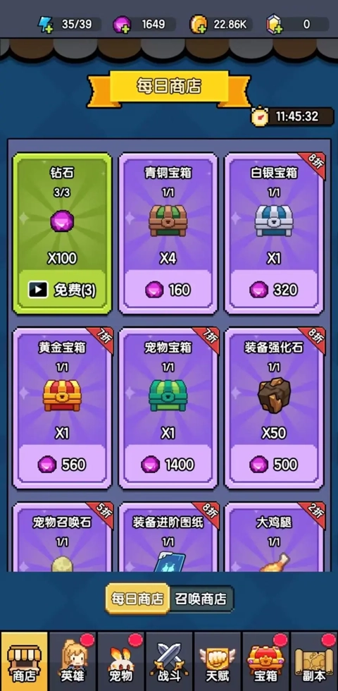 每天商场都会发放100颗免费钻石,领取完这100颗后,还能通过观看广告额外领取三次100颗钻石的机会——算下来总共能免费拿到400颗钻石,一定要全部领完!