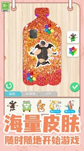 还能添加各类装饰配件,比如闪钻、贴纸、挂饰等,发挥想象力打造独一无二的专属手机壳,相当的有趣。