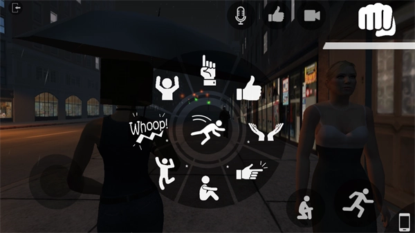 4、进入游戏后,可先点击【chat】进行对话;左侧的圆圈按钮用于控制前进或后退,右侧的按钮则对应蹲下和跳跃操作;此外,点击右下角的【手机】图标,还能进行拍照或打电话的操作。