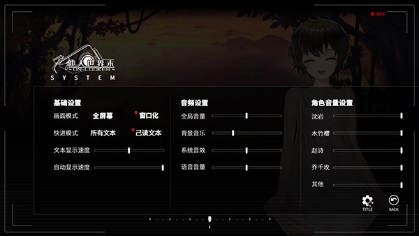 8、点击【CONFIG】按钮能够打开游戏的全局设置界面,该界面包含了基础设置、音频设置以及角色音量设置等内容。