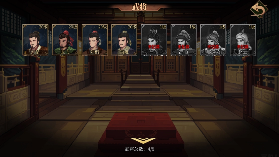 目前武将共有8位,具体包括刘备、张飞、刘楷、简雍、吕布、高顺、邢道荣和赵云。