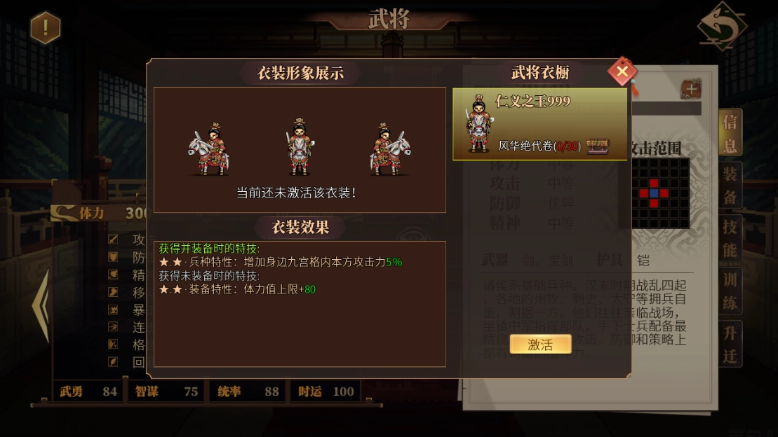 除了基础属性,可以直接在武将面板查看8大面板值(攻击、防御、精神、移动、暴击、连击、格挡、回避)