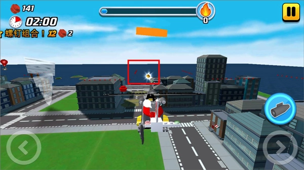 2、进入空中消防关卡,控制直升机洒水,按照指示直走,路过一个龙卷风,龙卷风后面一个就是金砖,飞过龙卷风区域绕一圈就可以看到金砖,控制直升机飞往金砖上就可以直接获得,之后照常灭火即可。
