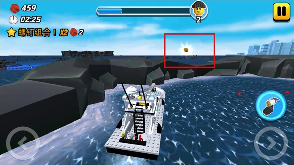 3、进入海上警察关卡,选择海上交通工具,开始游戏,玩家在追逐坏人的时候要注意金砖就在海上一个礁石圈里,玩家需要控制海上交通工具进入金砖范围,利用金砖附近的跳板使玩家升高并控制方向朝金砖前进即可获得金砖。