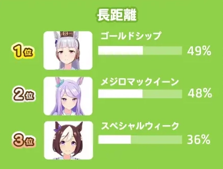 解析:中距离赛事的马娘竞争愈发激烈,越来越多的马娘竞相登场展现风采,这也使得马娘的整体出场率较以往出现了显著下滑。美浦波旁依旧在榜单之上,而原本榜上有名的小栗帽则遗憾地被挤出了榜单。