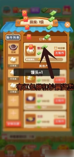 有红包券和钞票奖励,馒头订单制作成功。