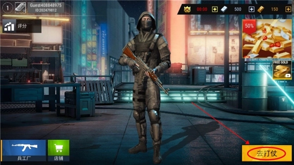 1、现代枪射击战争游戏安装完成后,选择点击客人账户类型;