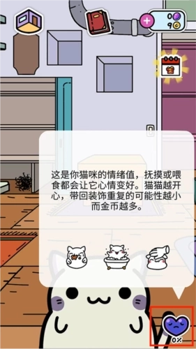 3、进入猫咪房间后,能看到右下角显示猫咪的情绪值。你可以通过抚摸或喂食的方式让它心情变好,猫咪越开心,外出时带回来的金币就越多,重复带回的物品也会更少。