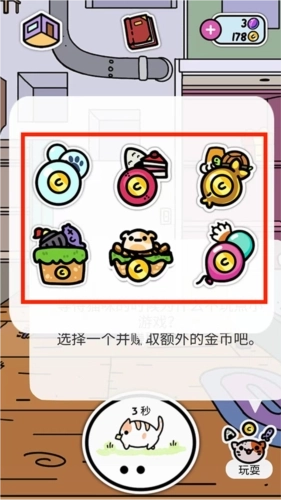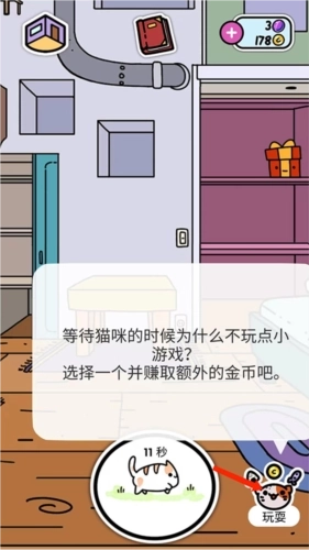 9、在等待猫咪外出的过程中,也可以点击右下角的【玩耍】选项,这里提供了多种不同的小游戏可供选择,而且玩这些小游戏还能额外赚取金币。