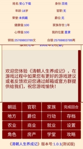 你可以通过游戏界面下方的朝廷、官职、家族、行动、农业、商业、就业、角色、房产和学堂等互动模块,提升自身的官职等级、荣誉值以及各类资产。