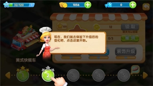 游戏一共有40关,每过一关才能解锁下一轮和升级,每一关系统分配的赚钱目标的收益都会有所递增,以及能否解锁拥有先进的厨房灶具和忠实的顾客等。而厨房升级最为重要,直接影响你店铺的出餐效率。下面小编以美食快餐车为例。