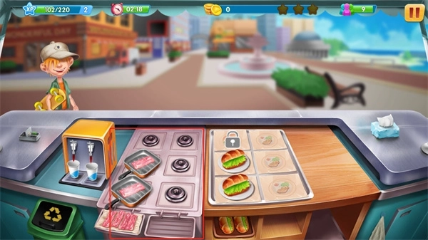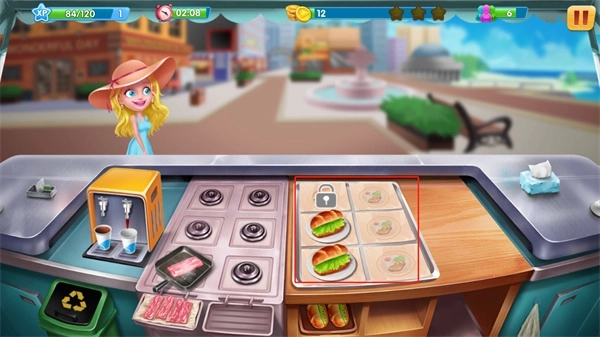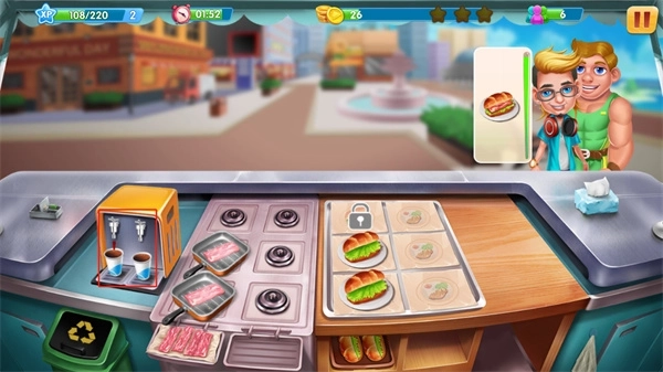 进入营业后,你的客人会源源不断的前来消费,此时你需要根据顾客的点餐需要来制作对应的食物,而这里的制作方式是分开进行的,也就是说,配料的搭配显得尤为重要,每一样顺序就更加重要了,若搭配失败怎么办?只能将制作好的食物丢掉了,而这将影响顾客的耐心,并有损时间,限定时间内完不成目标,将得不到三星评价,也就意味着玩家要升级的速率变低。