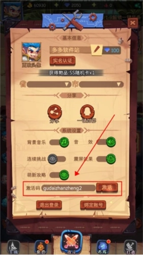 在游戏里点击左上角的头像,然后输入激活码就能兑换奖励啦。SS随机卡会发放到背包中,背包的位置在主城左上角哦。这是专门为萌新大大们准备的福利,能帮大家轻松度过游戏前期。具体操作是:点击左上角的英雄头像,在像图里箭头所指的位置输入激活码,就能领取这份奖励了。
