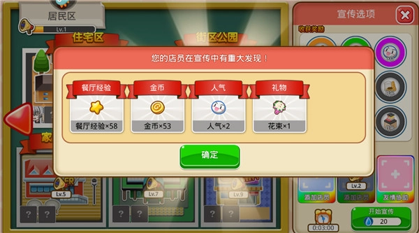 玩家能够通过外出宣传的方式为餐厅进行推广,提升餐厅的知名度,从而吸引更多顾客前来就餐。