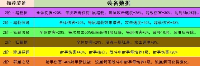 推荐装备搭配方案:2阶·超载枪、2阶·超载倍镜、2阶·狂暴法杖、2阶·狂暴帽,再加上射手或法师的核心装备与新技能装备。