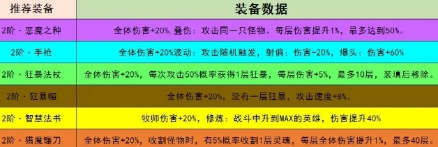 推荐的装备搭配方案为:2阶·狂暴法杖、2阶·狂暴帽、2阶·猎魔镰刀、2阶·智慧法书、2阶·手枪以及2阶·恶魔之种。