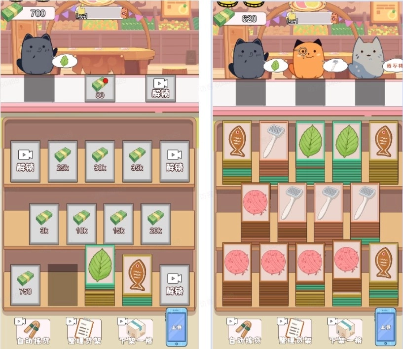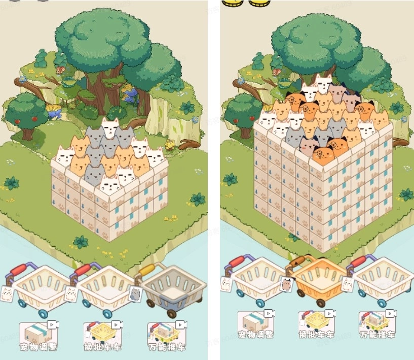 根据购物车中显示的猫咪需求,点击对应颜色的猫咪,就能逐层解锁后续内容。