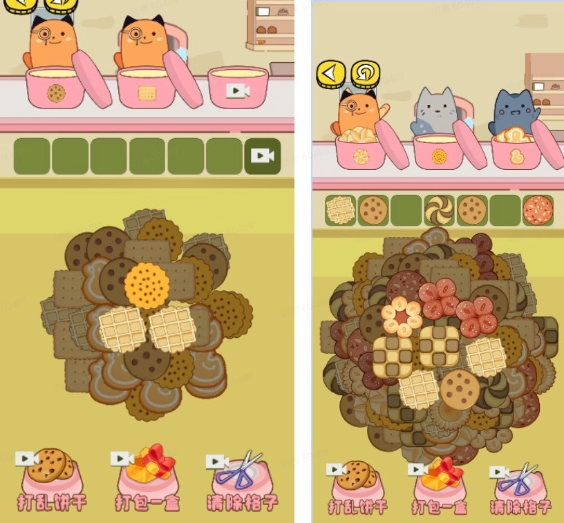 按照小猫顾客的要求,点击三块一样的饼干就能打包拿走啦