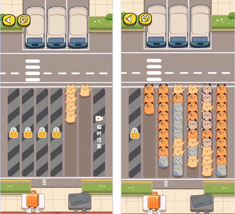 点击“候车”按钮让猫咪排队,每当一个队伍排满时,就可以点击“上车”按钮送走这队小猫。
