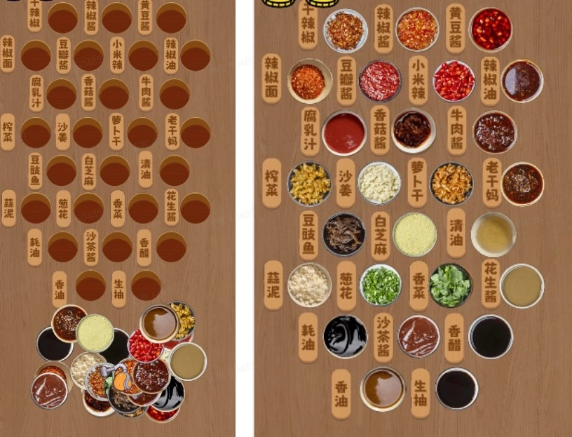 把所有调料拖到对应名称的空位里,点一下吸尘器就能整理还没摆放好的调料。