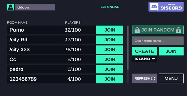 3、左边是随机房间,点击“JOIN”就能加入,你也可以点击右边的“CREATE”创建房间,邀请好友一起玩。