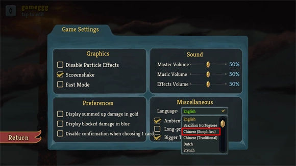 3、进入设置界面后,点击language选项并选择Chinese,即可将游戏切换为中文版。