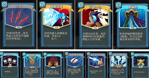 输出牌包含:暴雪(效果与冰球产出数量相关联)、弹幕齐射(效果与球位数量相关联)、精简改良(多次打出后会变为0费的输出牌)、爪击(具备成长特性的输出牌)、漆黑+(可通过多次控制实现伤害成长)、电击(用于冰混电体系的输出牌);