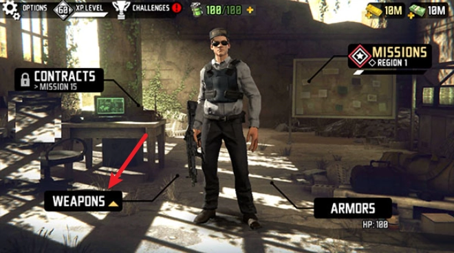 主界面的左右两侧各设有一个按钮,左边是“WEAPONS”,对应武器功能;右边是“ARMORS”,对应护甲功能。