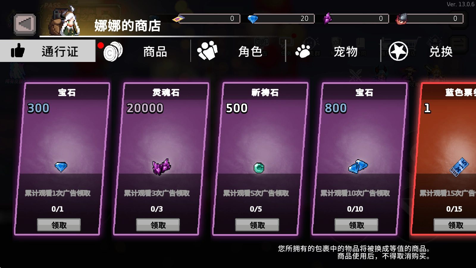 、游戏商城:1000钻石+500钻石+5W灵魂石+3倍券1张+1W钻石+ ban位260个。注意:仅限一次的是永久只有一次,每日20次建议每日获取完哦,不会存留,每天都会刷新掉。