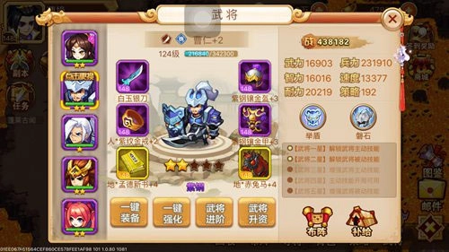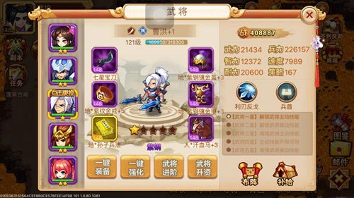 奖励装备:打五虎的武将选择方面,由于是平民萌新而非土豪玩家,推荐使用100级-120级的1星魏延、1星曹洪、1星曹仁、2星大乔搭配1星颜良(或文丑),或者1星魏延、1星曹洪、1星曹仁、1星许褚搭配2星大乔这两套组合。选将思路:通常玩一个多月后,除了许褚之外,其他武将基本都能获取;作为平民萌新,没有秒天秒地的实力,只能依靠猥琐的防守反弹战术通关,因此选将核心是多选带反弹技能的肉盾武将以及血量厚实的肉将,除了上述提到的武将外,周泰、于禁、小乔等也都是合适的选择。