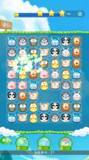 1、玩法十分简单,只需移动小动物方块,让三个及以上相同的方块连成一线,即可完成消除;