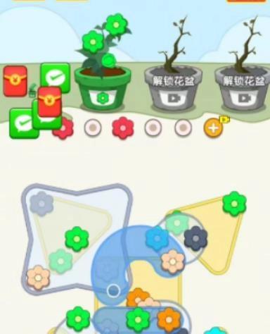2、凑齐三个:成功解开相同颜色的螺丝后,将其放入花盆中,凑齐三个即可消除。