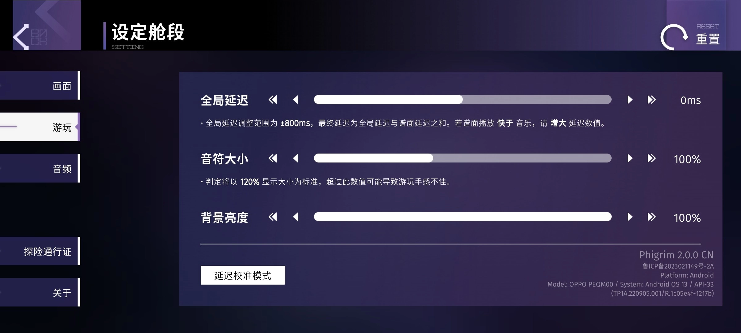 同Phigros一样,一些基础设置,比如按键大小,背景亮度是两款游戏都有的,也就是全局设置;与Phigros不同的是,由不同机型,不同设备制作的谱面,其屏幕比例,延时不尽相同。因此除了全局设置外,还有谱面设置。接下来会对两种设置进行介绍。