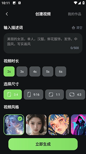 2、点击AI视频进入,输入描述词,选择喜欢的视频风格就能快速生成视频。